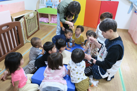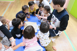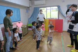 戸外に出かけられない今日は 「できるかな」の絵本に合わせて 動物の動きの真似をして 身体を動かしました