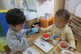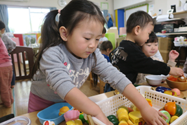 ひよこ組さんも 切ったり 配膳したり 考えて遊べるようになっています