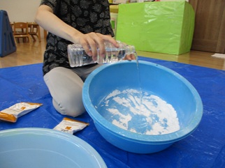 みんなが触ったさらさらなこの粉に、水を入れて混ぜ混ぜすると…