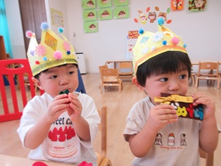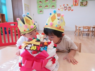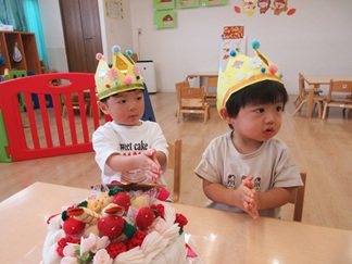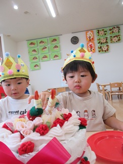 仕上げにお誕生日の2人にロウソクを立ててもらいましたよ🎀
